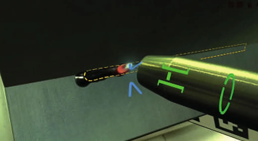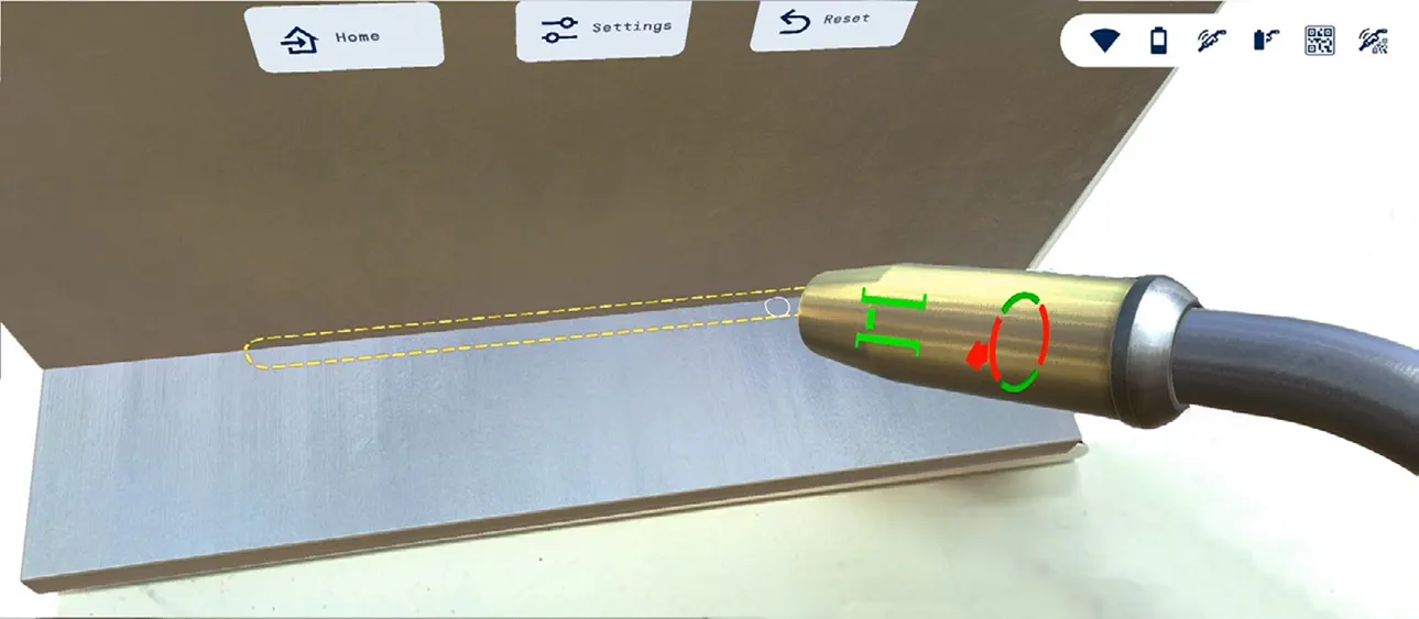 Comme avec le SOLDAMATIC, l’apprenti fait l’exercice avec une image de soudure réelle. Le système indique la zone à souder, le point de départ et la direction de soudure, l’inclinaison de la torche et la distance torche-pièce.